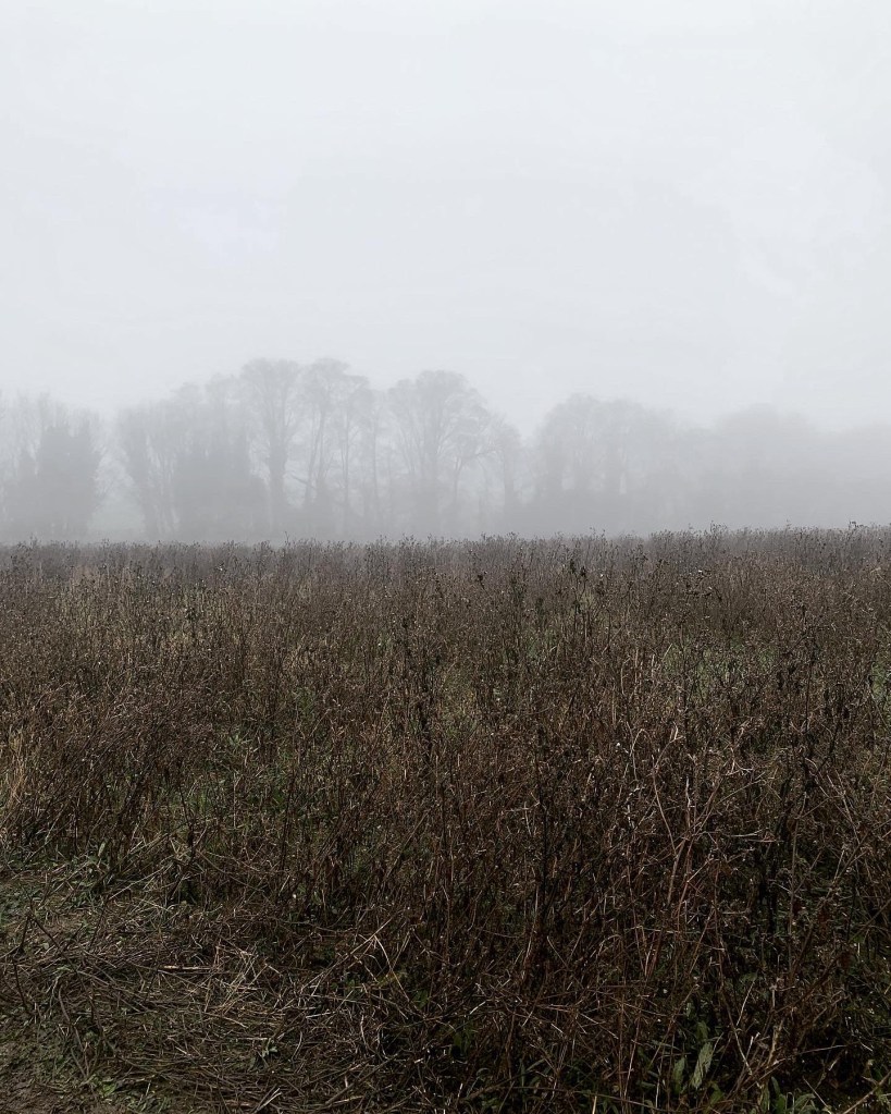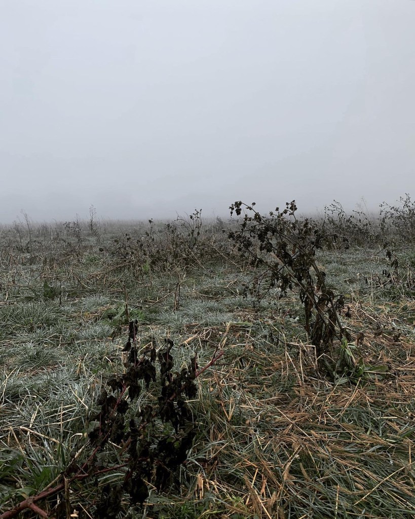 The fields this morning – sharp to the flesh but thick to the eye, a pinching chill with a heavy fog.