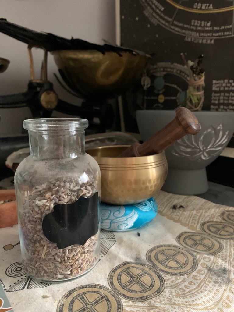 I take my herbs and my oils and my full moon water and combine into a sacred concoction. Draining the herbs from the mixture, I create a small vessel of potion to use upon my own vessel of existence. Ancient drumbeat and burning sage fill the air as I smear the potion over my belly and breasts, awakening my ancestors.